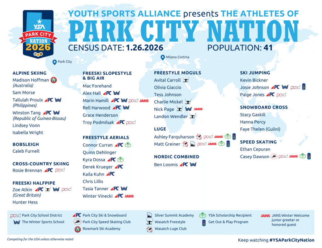The Youth Sports Alliance announced the Olympic athlete delegation representing Park City Nation at the Milano Cortina Winter Games next month. The delegation is made up of athletes who train with one of the seven Youth Sports Alliance (YSA) partner winter sports teams, as well as athletes with strong ties to Park City or who call the community home. Paralympic athletes will be named next month.